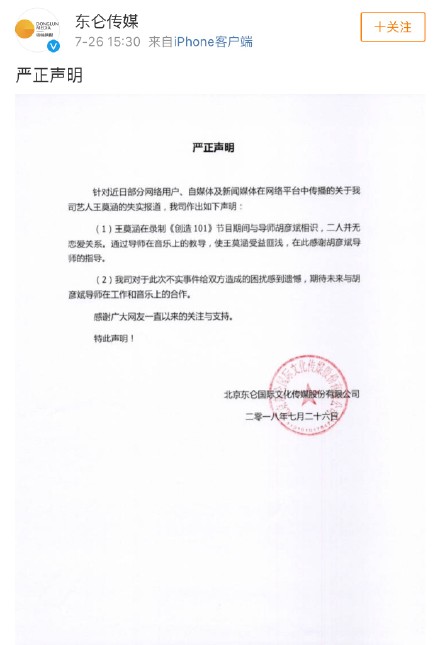 對此王莫涵的經紀公司也發表否認聲明,內容指出對於:網路上謠傳兩人戀愛並非事實,同時也很感謝胡彥斌對王莫涵這段時間的指導,期待未來師生以後在音樂上的合作。
