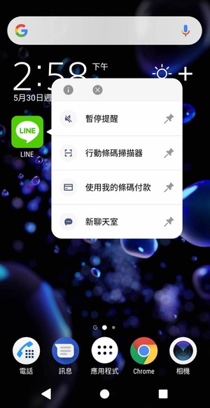 第二項新功能是懶人「捷徑」,只要輕輕按住LINE的Icon,不需要打開App,就能使用和iOS 3D touch一樣的快捷鍵,長按後會看見「暫停提醒」、「行動條碼掃描器」、「使用我的條碼付款」、「新聊天室」這四項功能,是使用起來十分方便的懶人妙招。以上功能支援Android手機作業系統8.0(含)以上、以及LINE Android版本8.7.0(含)以上,更新為最新版本就能夠輕鬆使用 !