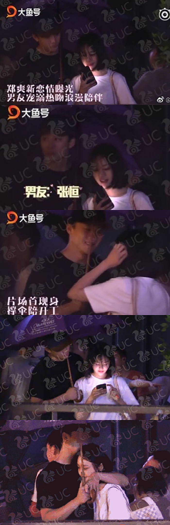 鄭爽在某晚拍攝新戲結束收工後與一名男子見面,兩個人共撐一把傘,甜蜜地依偎在馬路旁,鄭爽用手機時,男方手也沒閒著緊摟著鄭爽,不時的親吻著鄭爽的頭髮,之後兩人一同進到鄭爽劇組安排的飯店,鄭爽的表情也洋溢著幸福,宛如戀愛中的小女人。