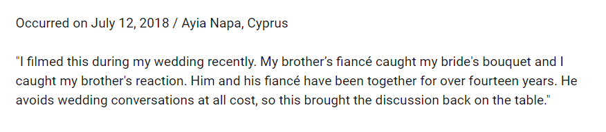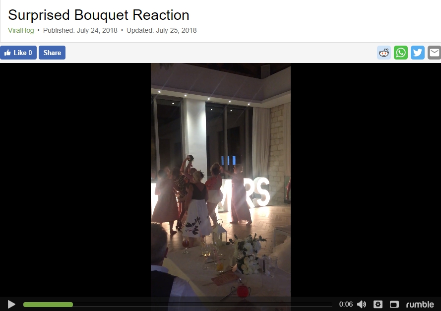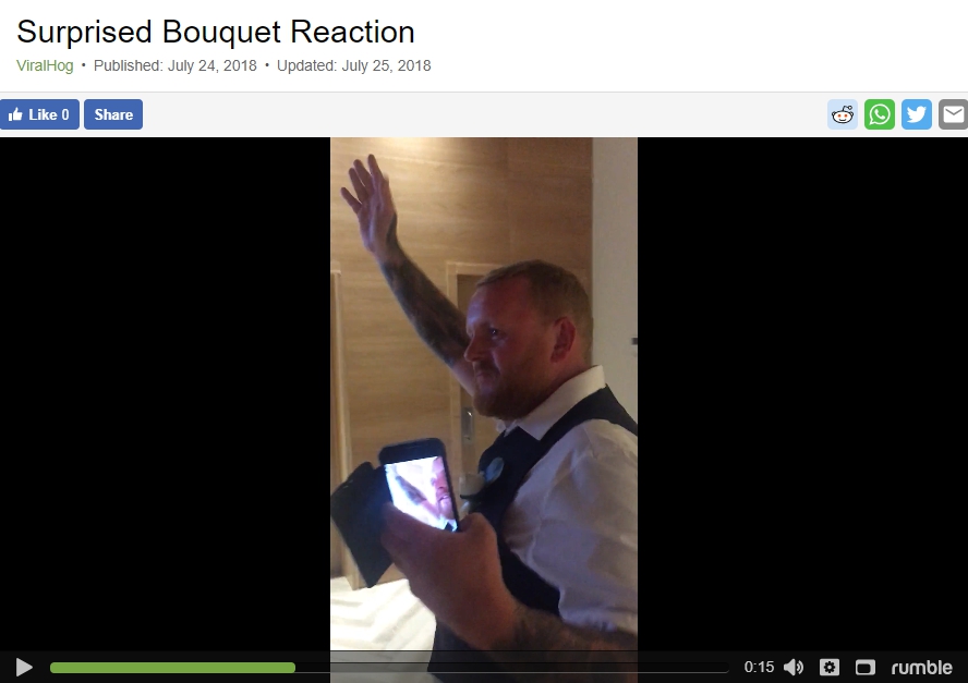 一位新郎上傳了自己婚禮的花絮,只見美麗的新娘站在前方,後面則是一堆興奮的女賓客,新娘一拋出捧花,現場的女子都非常賣力高舉雙手,搶著當下一位幸福的新娘,其中一個女子最後接到了捧花,在場所有賓客都為她鼓掌叫好,不過新郎將鏡頭對準女子的男友後,卻發現對方一臉錯愕,瞪大眼睛呆傻在原地,絲毫沒有喜悅的感覺,愣了4秒之後,才擠出苦笑,對眾人揮手致意。雖然當下的反應有點無奈,但最後還是溫馨的到女朋友身邊,給她一個輕輕的吻。