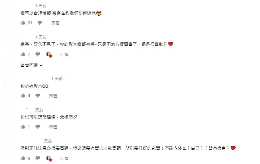影片一出便獲得許多粉絲的認同,不過也有粉絲留言「我可以合理懷疑,奈奈在教我們如何追她」,猜測這可能是星光奈奈選對象的標準,也有網友梳理出「在有實力的前提下高調」代表必須先「充實自己」,不論內在外在,才有追女神的資本。