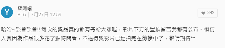 而對此也釣出了蔡阿嘎本尊來回覆,阿嘎針對上述模仿大賽的爭議做出回應:「每次的獎品真的都有寄給大家喔,影片下方的置頂留言我都有公布。模仿大賽因為作品很多花了點時間看,不過得獎影片已經拍完在剪接中了,敬請期待」,對於曝光私生活則沒有多做說明,只能說每個人觀感不同。