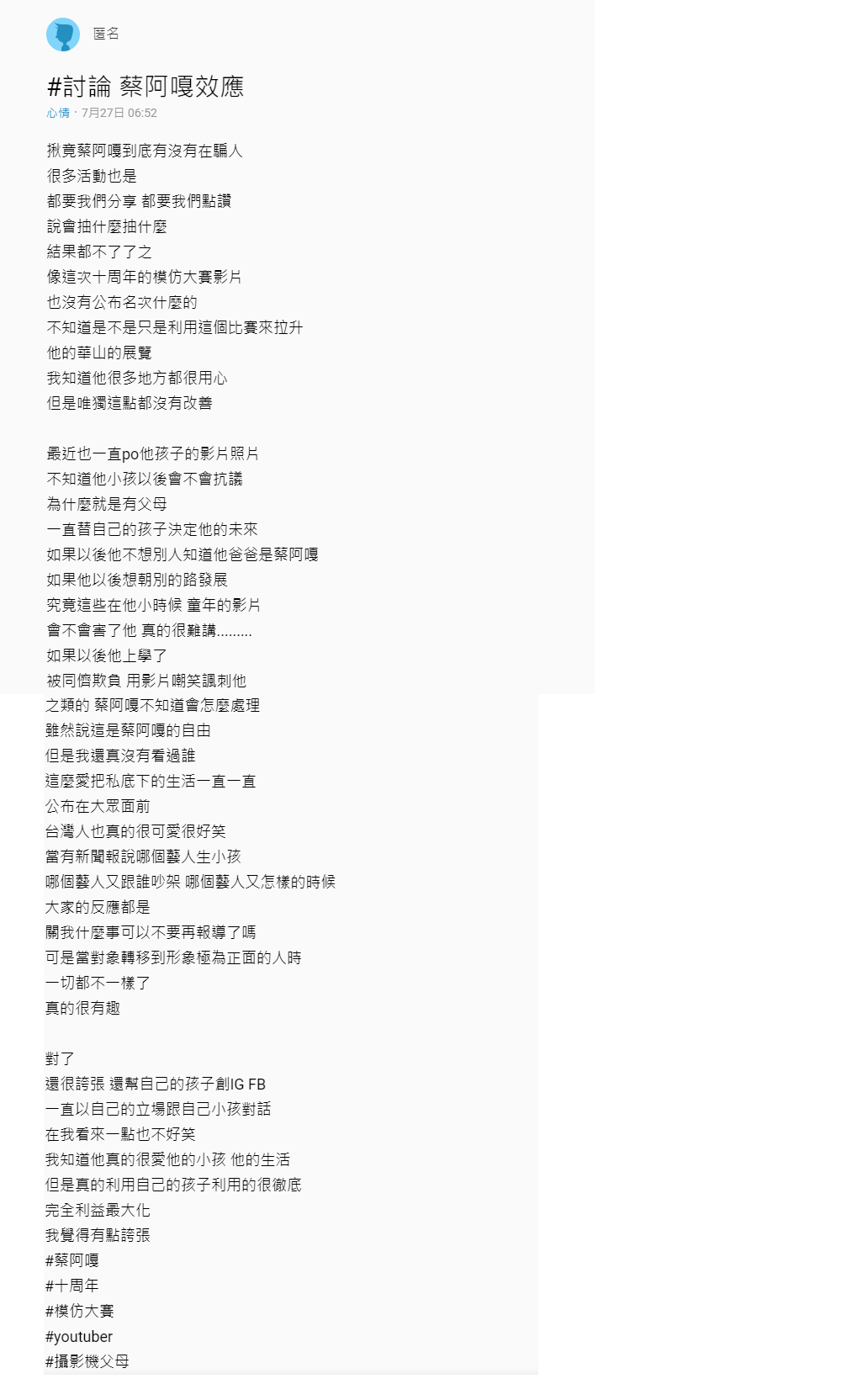 而他最後也表示自己認為蔡阿嘎曬子的行為根本是在利用蔡桃貴:「但是真的利用自己的孩子利用的很徹底,完全利益最大化,我覺得有點誇張」,最後更hashtag「攝影機父母」,對於蔡阿嘎的方式難以苟同。而對於該網友的論點,也引起許多網友討論。