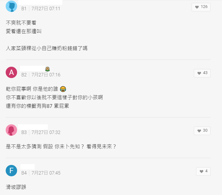 有許多網友表態挺阿嘎,紛紛留言:「全部都你在講,用了一堆假設性用詞,根本就滿滿主觀立場」、「乾你屁事啊 你是他的誰」、「是不是太多猜測 假設 你未卜先知? 看得見未來?」、「你是不是家庭沒溫暖」,但也有網友反串留言:「人家菜頭粿從小自己賺奶粉錢錯了嗎」,認為原po不無道理:「如果我童年大家都看得到我會很崩潰根本黑歷史」。