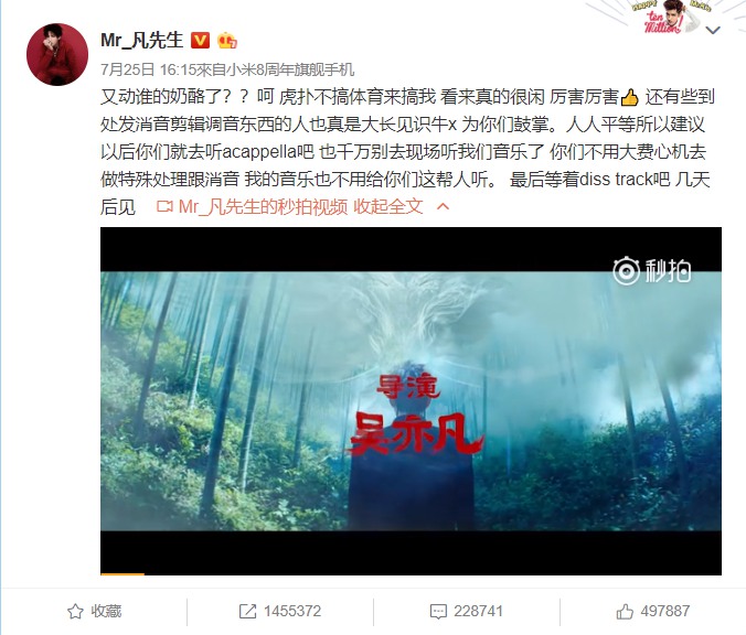 7/25日有網友放出吳亦凡「無修音」的現場說唱,沒多久吳亦凡個人工作室就發表嚴厲聲明,聲稱:音頻利用消音、剪輯、調音等惡意處理,已涉及嚴重侵權。他也親上微博回覆此事件,並烙下狠話要用「Diss Track」反擊。