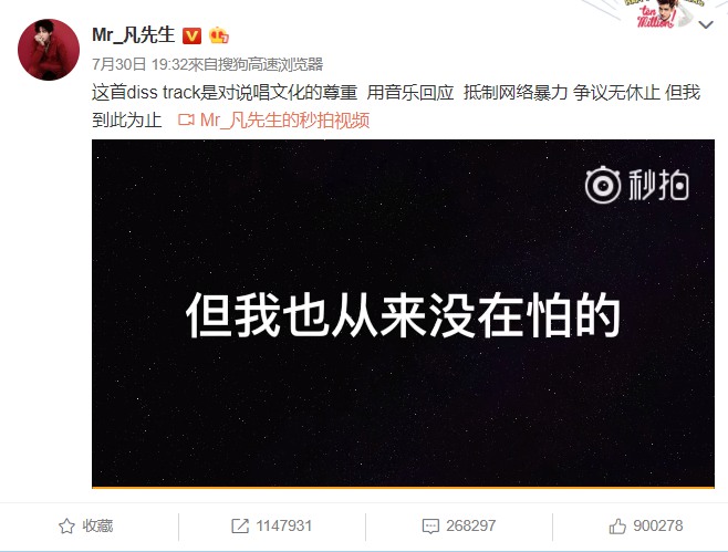 果不其然他如期在7/30日發表新歌,用作品回擊那些酸民與爭議,兩分鐘的音頻裡上著反擊的歌詞,開頭就說這首歌沒用什麼特別音效,純原聲獻唱,他更反擊那些說他不會說唱的,是因為那些人不懂說唱的多樣風格,更直言對酸民與抨擊:「他沒在怕的!」。他在微博發文表示:「這首diss track是對說唱文化的尊重 ,用音樂回應,抵制網絡暴力,爭議雖然無休止,但自己將會到此為止。」吐露出自己的期盼與心聲,表達現代人在網路言論上太過放縱,都不用負責任,希望在這網路流行的世代下多給些尊重。