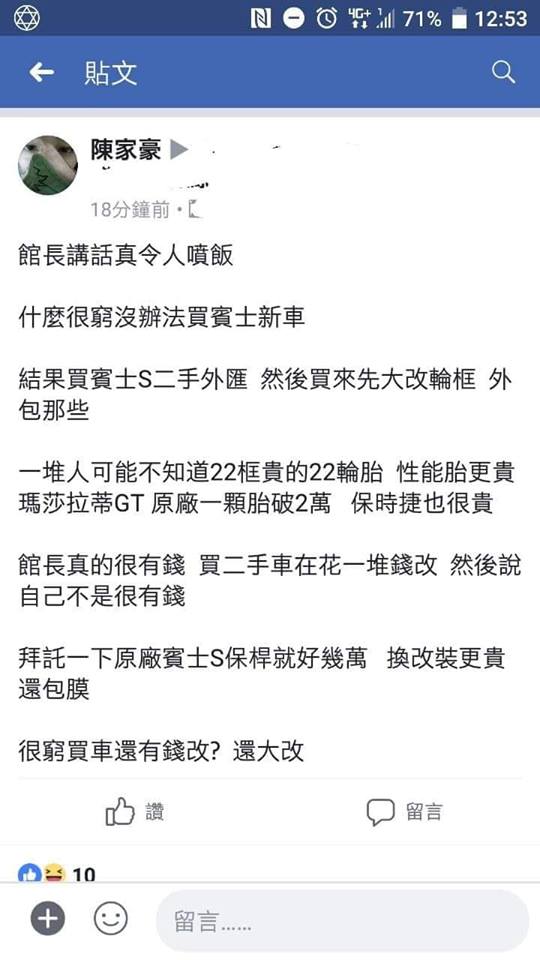 館長昨在臉書放上新買的賓士車改裝的模樣,更開心表示:「再等10幾天」,粉絲們也紛紛大讚館長的新車霸氣十足,恭喜館長買新車。不過卻有網友po文表示:「館長講話真令人噴飯,什麼很窮沒辦法買新車」,他表示買賓士S二手外匯的話,再改裝其實費用非常驚人:「拜託一下原廠賓士S保桿就好幾萬,換改裝更貴還包膜」、「很窮買車還有錢改?還大改?」。