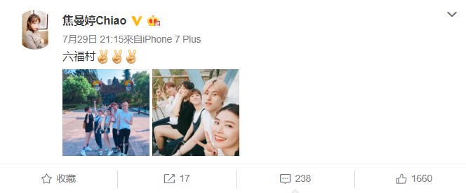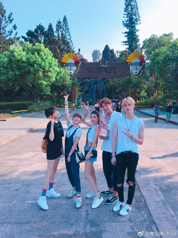 焦曼婷在7/29晚間在微博發文,文中透露出:六福村,配圖是與一群好友在六福村主題遊樂園的合照,看得出來照片散發出青春洋溢的氣氛,炎炎夏日中她身穿oversize的黑色T-shirt營造出「下衣失蹤」小露性感的穿搭感。合照中可以發現還有另外一名女孩非常眼熟那就是台灣女團Popu Lady成員劉宇珊,宇珊同樣也參加過《創造101》,看來這次焦曼婷回到台灣後,跟宇珊的仍舊保持聯繫還友好的相約到六福村遊玩。