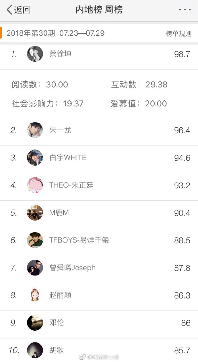 此次「內地榜」周排名前五名依序為蔡徐坤、朱一龍、白宇、朱正廷、鹿晗。有微博網友分析,穩坐冠軍的蔡徐坤,有賴大批粉絲斥「重金」增加愛慕值,而朱一龍和白宇的聲勢則隨著爆紅的電視劇《鎮魂》水漲船高,此外,鹿晗則因為和邵雨薇搭檔新劇《甜蜜暴擊》,持續維持高度討論。