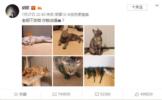 近日,胡歌微博出現不少生活照和心情小語,大批粉絲也樂見胡歌發文,像是療癒的曬貓照,引起網友回應「你是我們都愛的胡貓貓」。