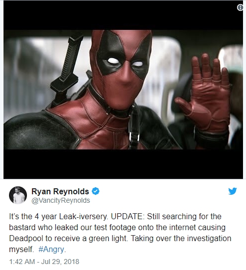 ▼在這個間接改變演員職業生涯的日子,萊恩雷諾斯在推特上再度發出死侍言論:「今天是洩漏 4 周年紀念日。強調一下:我還在搜查到底是哪個混蛋把我們的測試影片洩漏到網路上,導致《死侍》電影項目獲得了綠燈許可進行拍攝,我要親自審問調查 #憤怒」。許多網友被萊恩雷諾斯這一段言論笑翻,也跟著他一起慶祝這個特別的紀念日。