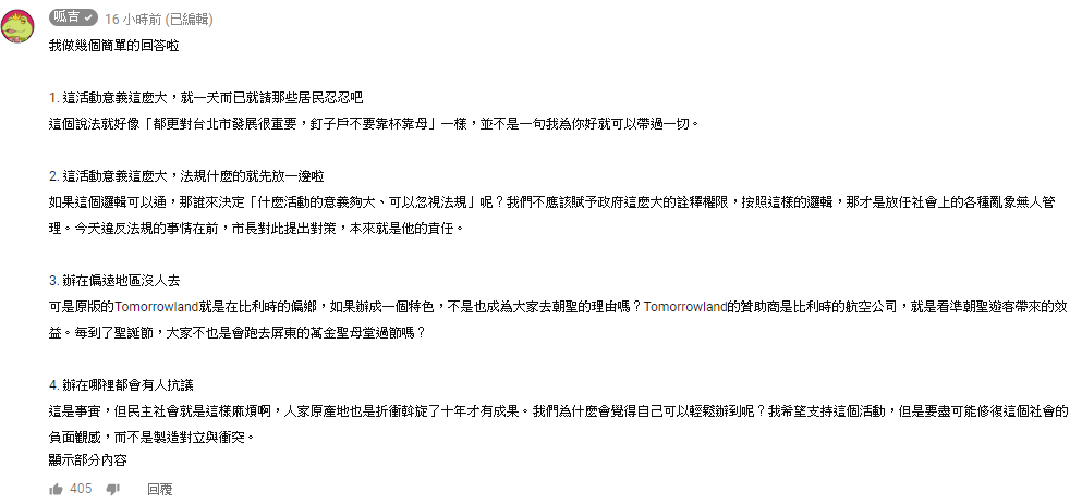 原來「Tomorrowland」的發源地Boom在比利時並不是像台北一樣是首都,而是偏鄉,台北的人口密度更足足是Boom的五倍之多,噪音的影響也更大,故舉辦活動本身沒有問題,地點卻並不一定要在台北!呱吉也做出結論:「做為市長,沒有讓一個優質的活動符合法規運行,的確應該跟生活受到困擾的居民道歉」。