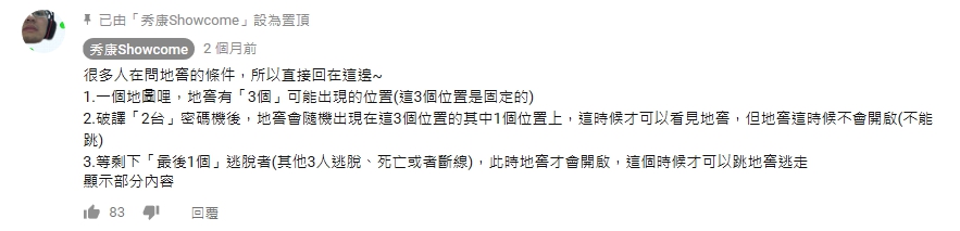 人氣實況主「秀康Showcome」為了解決迷途新手們的煩惱,發布了一支新影片「全地窖位置」 大解析,幫助求生者們找到地窖,順利逃脫。影片中秀康直播遊戲地圖,實際操作角色前往幾處地窖會出現的位置,如「軍工廠」中大工廠的後方、地圖中央的貨櫃旁邊、及比小屋更邊緣的角落處,「聖心醫院」則是在小屋的門口附近有一個、再往前走到邊界處有第二個、神像旁邊還有一個,「紅教堂」的結婚婚典禮區左右邊也各藏了一個,求生者們只要掌握了地窖可能出現的位置,便能有機會跳地窖逃生。