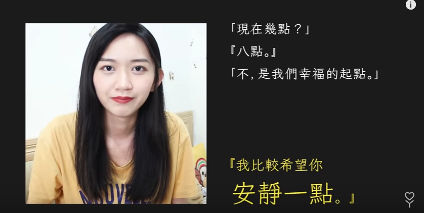 阿心逐一模擬每個可能被撩的場景,男友問:「現在幾點?」女友回:「8點」,霸氣的男友直接搖頭,並霸氣地說「不,是我們幸福起點」,看似相當有情趣的對話,阿心直接命中要點「我比較希望你安靜一點」。