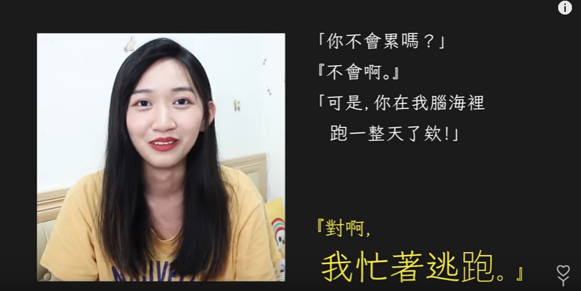 男友的花招不只一件,「你不會累嗎?」女友回應:「不會啊」,男友懊惱地說「可是,你在我腦海裡跑一整天了欸」,沒想到阿心直接給男友一個致命的一擊,「對啊,我忙著逃跑!」