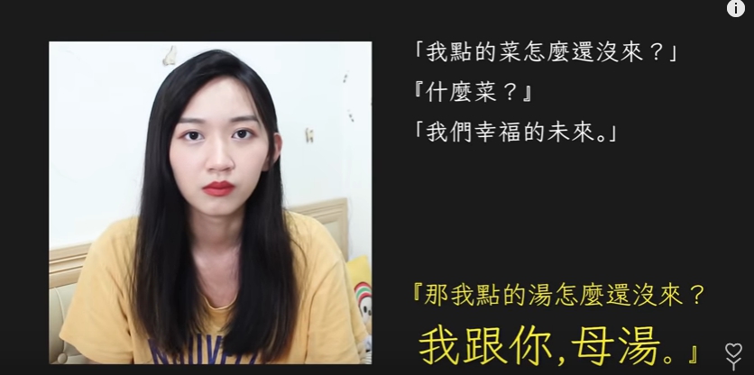 許多男女朋友都會一起享受美食,在等候菜餚時也可以展現魅力,男友問:「我點的菜怎麼還沒來?」女友:「什麼菜?」男友自以為很浪漫:「我們幸福的未來」,未料,阿心以「那我點的湯怎麼還沒來?我跟你,母湯」,成功反制!
