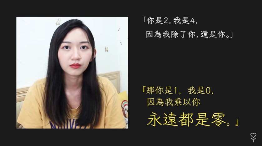就連「加減乘法」的撩妹語錄也遭阿心打槍,男友自信地說「你是2,我是4,因為我除了你,還是你」,沒想到阿心竟想出更火爆的語錄,「那你是1,我是0,因為我乘以你,永遠都是零。」