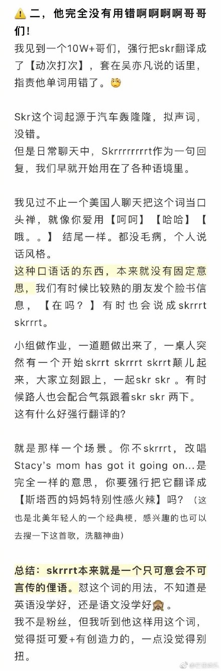 此外,中國網站上也顯示「skr」其實原先有3種意思。起先,應用在饒舌歌曲中,歌手想隱含「跑車」馳騁時,可用以表達「車輪與地摩擦的聲音。」;第二種使用時機為「表達不認同」;另也有讚美意味,顯示「對方很厲害」的意思。不過另有中國網友表示,「skr」在美國是相當口語化的用法,其代表意思常常會隨著對話情境有所改變,並不需要強行翻譯成固定用法。