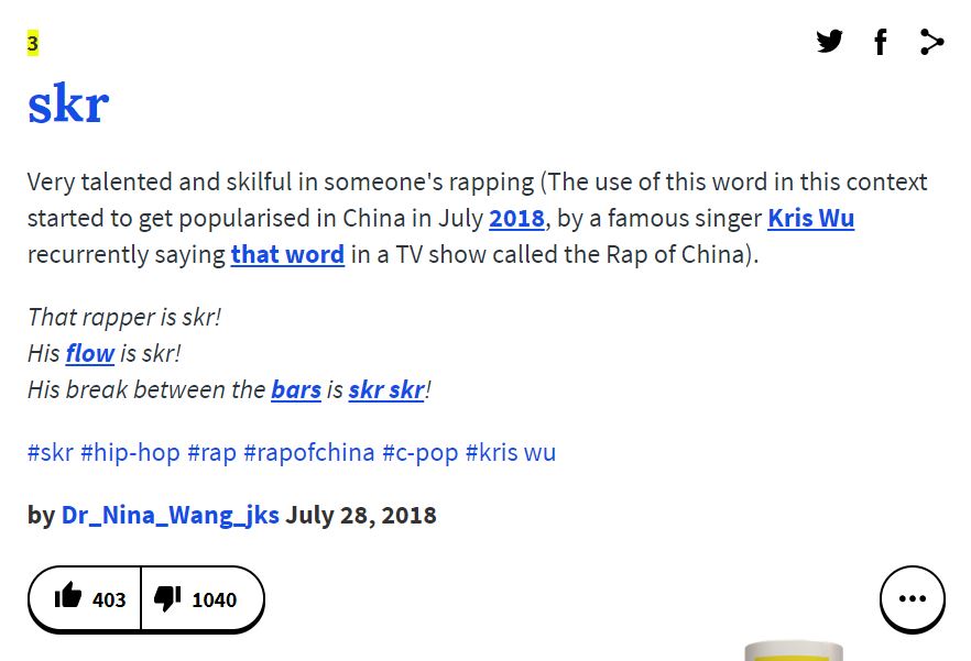 中國熱門綜藝節目《中國有嘻哈》第二季《中國新說唱》,導師和選手的對話內容往往蔚為矚目,去年節目上,導師吳亦凡一句「你有freestyle嗎?」成為熱門金句,近日,吳亦凡於節目中的「skr~」一詞,再掀模仿潮,甚至入選美國俚語辭典《Urban Dictionary》中。