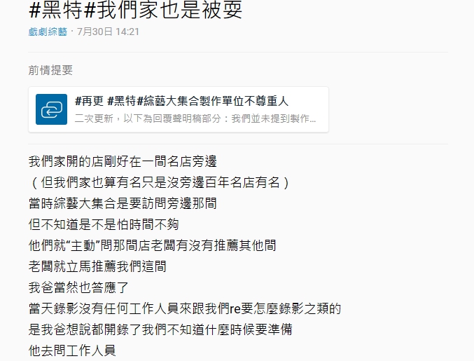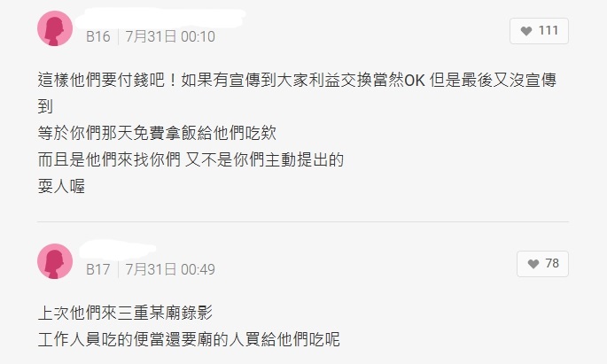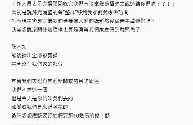 之後也有網友分享他們家的店被「騙吃騙喝」的事情,原PO表示節目組原本是採訪他們家隔壁的百年老店,後來又主動表示錄完隔壁要去他們家再錄一段,原PO爸爸得知後自然很高興,結果與原先說好的不同,節目組要求他們直接將食物端到隔壁說"請工作人員吃",播出後原PO才發現根本沒有他們家畫面,沒有宣傳效果,等於白請了節目組吃飯,讓他覺得非常不受尊重,像是被耍。文章底下也有網友表示節目組去也曾要求外景來賓提供工作人員伙食,相關事件層出不窮。