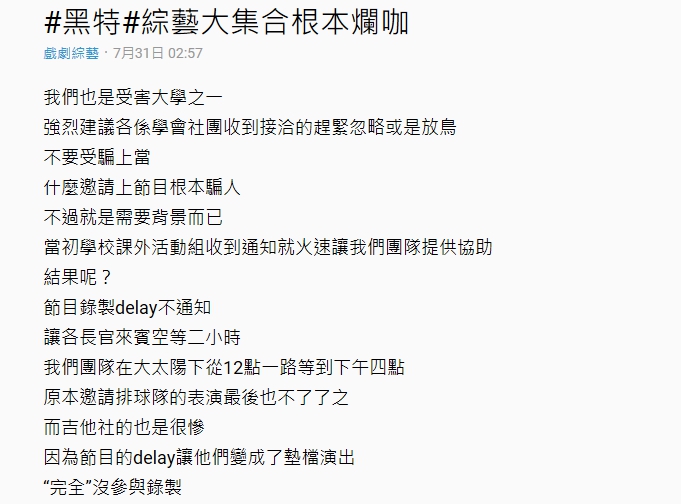 《綜藝大集合》時常會到各大學出外景,有時會邀請學生社團準備表演、參與錄製,然而近日在Dcard版上有人發文抱怨節目組一點也不遵重他們這些素人來賓,不但時程delay沒有通知、讓他們在大太陽下空等不知何時開錄,甚至有些社團花了一整天辛辛苦苦錄製完發現根本沒有播出,錄影時還任意對學生吼叫辱罵、態度不是普通的差,離開時留下滿地的垃圾沒有清理,怒批此節目根本「綜藝界的地溝油」!