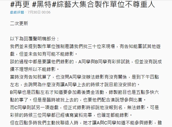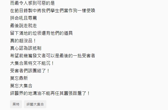 文章一PO出立刻引發網友積極回應,怒批節目組素質太糟糕,更有人爆料節目曾經以「可以上電視宣傳」、「可以參加比賽」等不同名目「騙」學生參與錄製,但其實只是淪為免費的備胎或是背景板,讓他們感覺被利用,甚至連車馬費都拿不到。