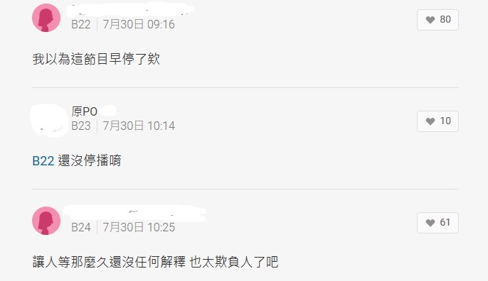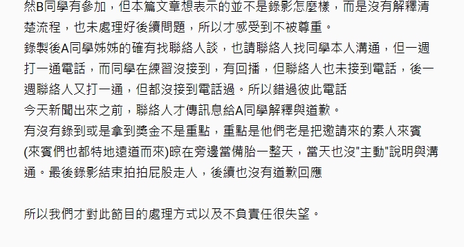 網友也在Dcard上做出對聲明稿的回覆,認為有沒有錄到或是拿到獎金不是重點,重點是節目組老是把邀請來的素人來賓晾在旁邊當備胎一整天,當天也沒「主動」說明與溝通。最後錄影結束拍拍屁股走人,後續也沒有道歉回應,因而節目的處理方式以及不負責任很失望。