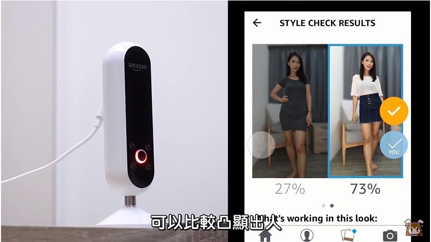 咪妃事先搭好了兩套穿著,並拿照片去詢問朋友、網友們哪一套比較好,接著便使用echo look測試一下。echo look是聲控的,只要講一聲「take a photo」就能拍攝照片,接著它就會以龐大的資料背景為基礎,分析哪一套才是比較好的選擇,測試結果與大部分網友一樣皆是選擇了右邊那套,可見echo look的基本審美值得信賴。除此之外,它還會依照使用者的風格,推薦適合的配件,十分貼心。