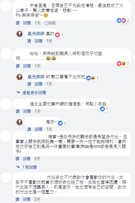 星光奈奈這次所提出的論點有別於過往所提倡的「用付出感動對方」的工具人精神,她自己也在臉書表示:「但自從我的這類文章上新聞後,不少談兩性的都在談不要付出太多,該高興嗎?」也讓許多網友大讚她是在傳遞正確的感情觀!