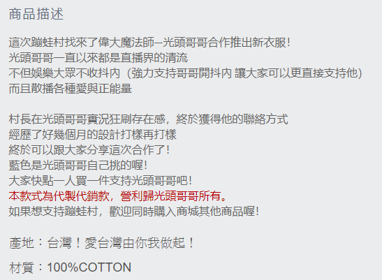 事實上這次出品的公司「蹦蛙」是亞洲統神的公司。「亞洲統神-張嘉航」過去因為遊戲中的名字為「超級蹦蛙」,後來創辦了「蹦蛙數位娛樂」當老闆,公司中除了統神、哥哥國動之外,還有龜狗、原味小品、小都Z等實況主。統神和哥哥國動也經常穿著自家服飾!這次他們也表示「村長在光頭哥哥實況狂刷存在感,終於獲得他的聯絡方式」表示蹦蛙主動找哥哥聯繫,十分用心才推出這次的聯名t恤,並且說明「本款式為代製代銷款,營利歸光頭哥哥所有」完全是為了哥哥。