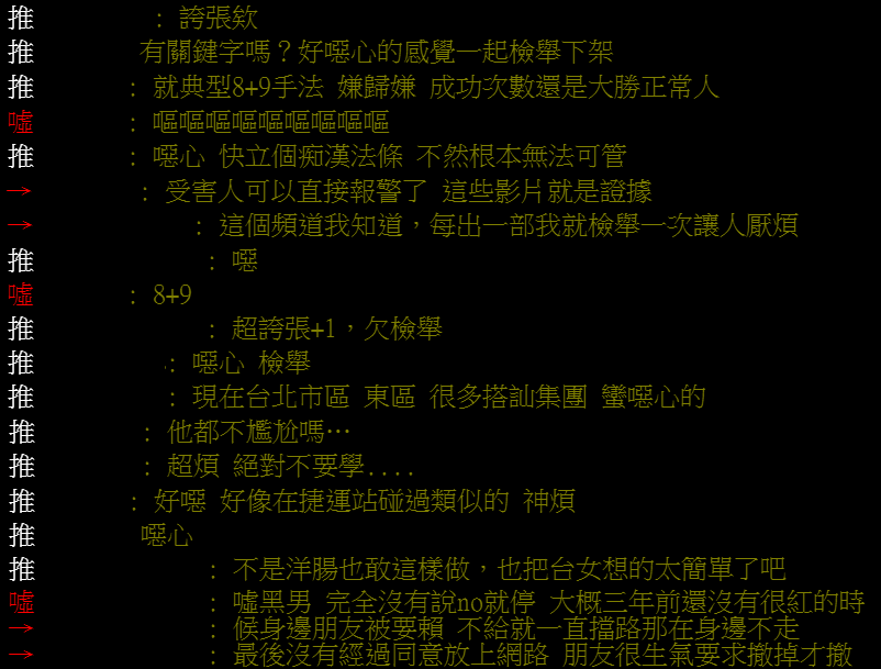 文章發布之後,鄉民也紛紛留言撻伐:「誇張欸」、「好噁心的感覺一起檢舉下架」、「就典型8+9手法」、「噁心,快立個癡漢法條,不然根本無法可管」、「受害人可以直接報警了,這些影片就是證據」、「每出一部我就檢舉一次」、「超誇張,欠檢舉」、「蠻噁心的」、「超煩絕對不要學」、「好噁」。