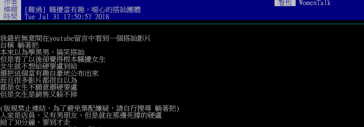 影片現在疑似已經下架,不過頻道仍有多部影片讓網友觀感不佳,認為他的方式根本是騷擾。另一方面該版主也表示,雖然黑男也以搭訕為主軸經營頻道,但相對躺著把強勢的態度,黑男只要聽到女生明確拒絕就會離開,卻也有網友提出相反的意見,說明黑男也曾糾纏搭訕的女子。其實許多網友都呼籲女生拒絕時要更堅決,才不會讓對方有騷擾的空間,若遇到糾纏不清的更可以直接報警。