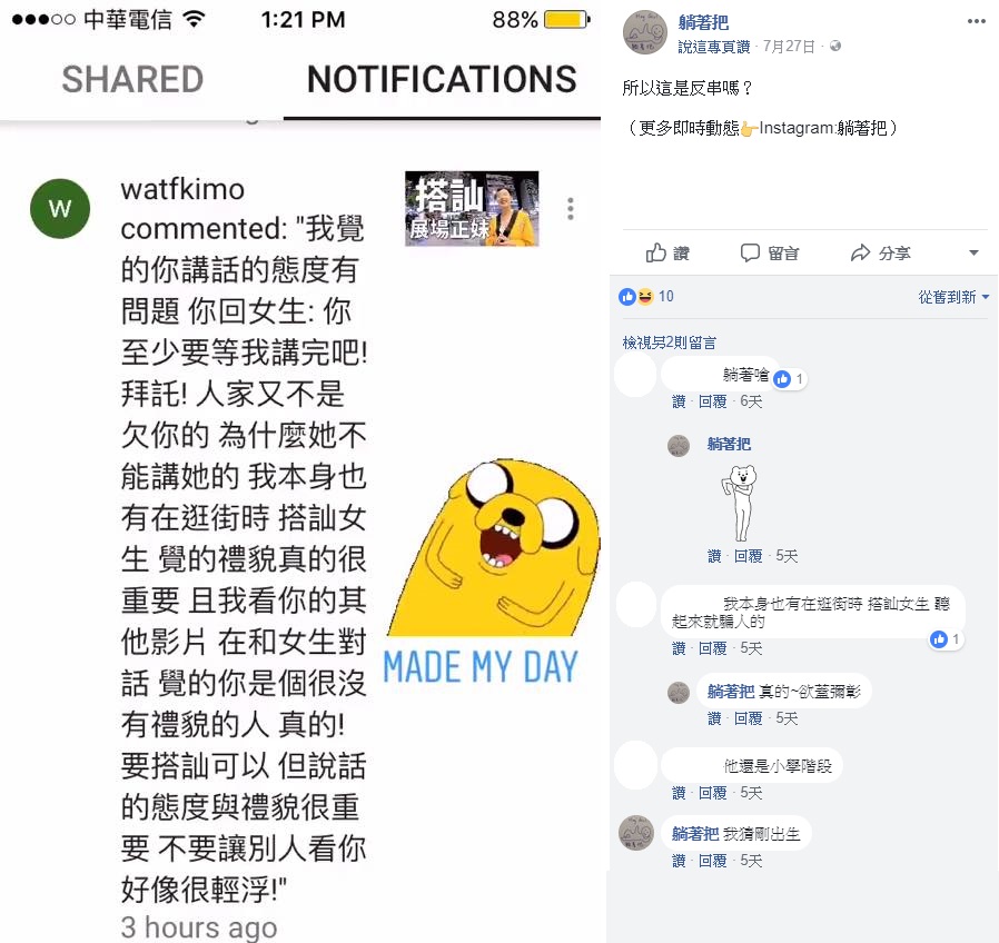 躺著把的粉專不僅遭灌一星評論,過去也有網友留言,表示認為其搭訕的方法非常沒有禮貌:「不要讓別人看你好像很輕浮」。而對於網友的建議躺著把則根本不當一回事,不僅貼上大笑的貼圖,更回應:「所以這是反串嗎?」,並且在留言處嘲笑對方:「我猜剛出生」。不僅如此,粉專中更可發現其為了課程推銷,曾用影片正妹的「無碼版」吸引學生,相當誇張。