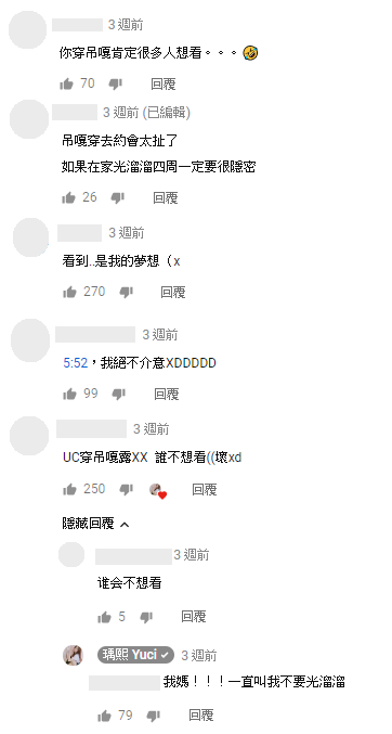 網友也在下方留言:「看到..是我的夢想」、「我絕不介意」、「吊嘎穿去約會太扯了」、「你穿吊嘎肯定很多人想看」、「UC穿吊嘎露XX誰不想看」,瑀熙也搞笑回覆:「我媽!一直叫我不要光溜溜」笑翻粉絲。