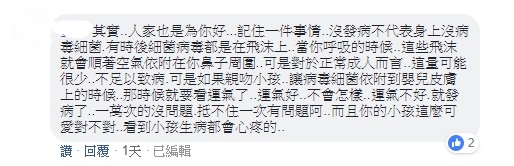 因為從懷孕期間就屢屢收到過度制止,T妹爆氣質疑這些人的醫學常識,認為他們對醫學常識一知半解就「老是說危言聳聽的話嚇別人,或過度糾正他人」連她身體健康僅僅是單純親吻寶寶臉龐也被罵,不可理喻。許多網友留言贊同,認為滿月前不能親寶寶只是老一輩的說法,並無醫學根據,不過也有網友認為寧可信其有,畢竟沒有發病不代表不是帶原者,凡是還是小心一點比較好。