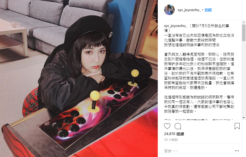 當天與友人難得見面相聚,聊聊心,陪同朋友到外面暗巷抽煙。抽煙不犯法,但我知道我有許多年紀比我小的粉絲群眾追隨我。這件事情的曝光以後,我深深意識到我的責任,對於我的不良示範我表示很抱歉,也希望粉絲能陪我度過這個成長階段,一直以來我都希望能給大家帶來正能量,我也會繼續保持我的笑容,我還是我。