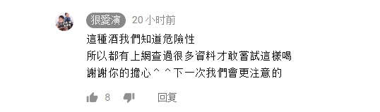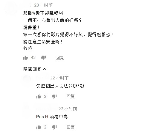 「生命之水」是96%的精餾伏特加,由於酒精濃度太高,一般都用於調酒的基底,單喝可能有酒精中毒的危險。有網友看完影片立刻留言警示「那種%數不能亂喝啦 一個不小心會出人命的好嗎?第一次看你們影片覺得不好笑,覺得超驚恐!」請他們小心危險,而「狠愛演」看了也回覆說明他們是查過資料才做出嘗試的,表示下一次會更注意安全。