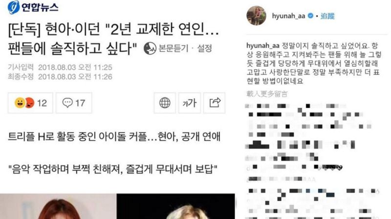 泫雅因為用胸部和翹臀撞師弟E‘Dawn的影片曝光,而被爆出姐弟戀傳聞,引發粉絲議論反彈,經紀公司還因此出現否認,沒想到3日竟直接打臉公司,在IG上貼出自己接受韓媒訪問的報導,大方坦承與E'Dawn已交往2年,並表示「我真的很想說實話」,是她出道11年來首度公開認愛。
