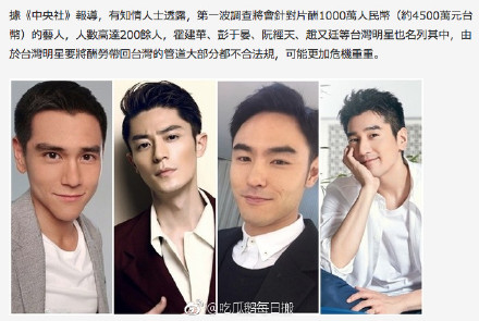 日前,爆料者崔永元就以放話,陰陽合同還有「一抽屜」,近日,大陸當局徹底清查「演藝圈逃漏稅」事宜,並表示已經握有演藝圈包括台灣明星,共200多人名冊。據了解,此次清查是由習近平親自下令,第一波調查將鎖定「片酬1000萬人民幣」的藝人,包括周杰倫、彭于晏、霍建華、趙又廷、阮經天等明星。