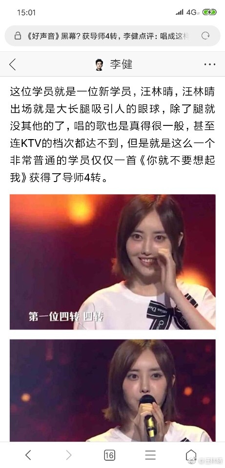 網友放大李健「難怪團體解散」評論,並在實際聽過汪林晴演唱紛紛表示,「這個節目怕有黑幕」。根據陸媒報導,網友並不看好汪林晴的演唱,評論她的演唱功力一般般,「連KTV水平都不到」,此外,更認為李健又要轉身又要酸言「團體解散」,是不是有內幕。