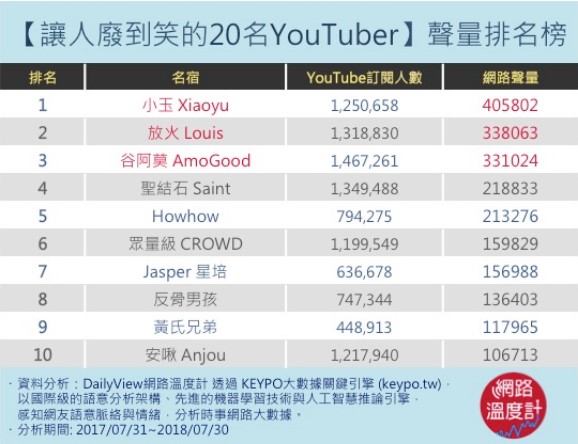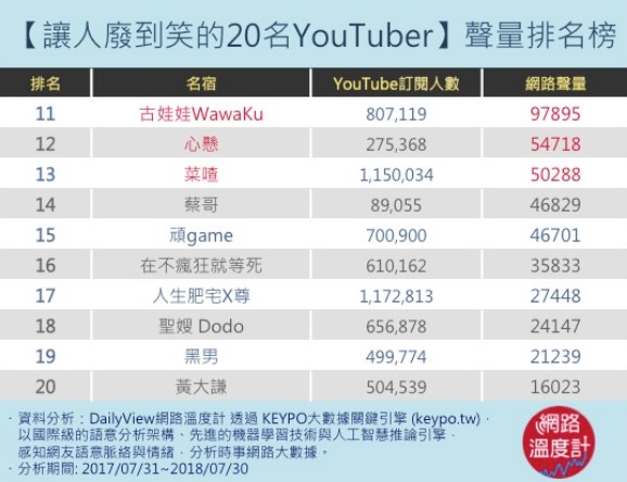 「YouTuber」是一個影音世代特有的新行業,在YouTube平台上傳影片、分享生活大小事及創意,賺取廣告收入,在年輕人擁有一定影響力。今日「DailyView網路溫度計」透過《KEYPO網路大數據》,整理出20位常被網友批評「好廢」,卻還是一看再看的「廢到笑」YouTuber !