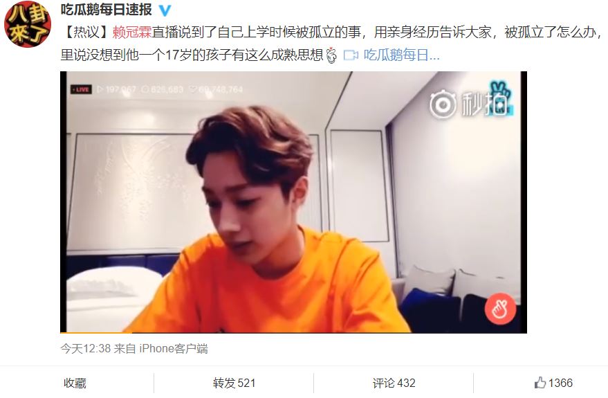 在團體中以rap著稱,而深受粉絲喜愛的賴冠霖,5日,在個人直播時爆料自己就讀國中時,是班上的「邊緣人物」,只因他的個性比較內向。賴冠霖在影片中向粉絲吐露心事,並表示:「和同班同學就是合不來」。