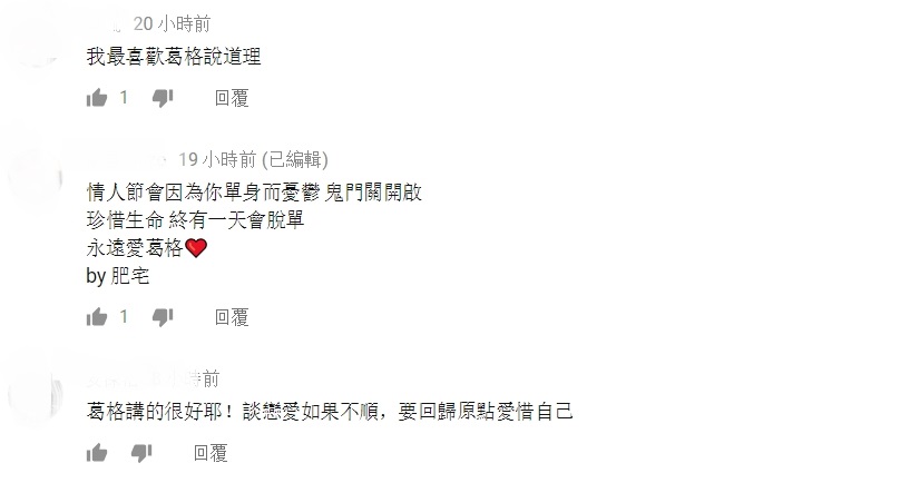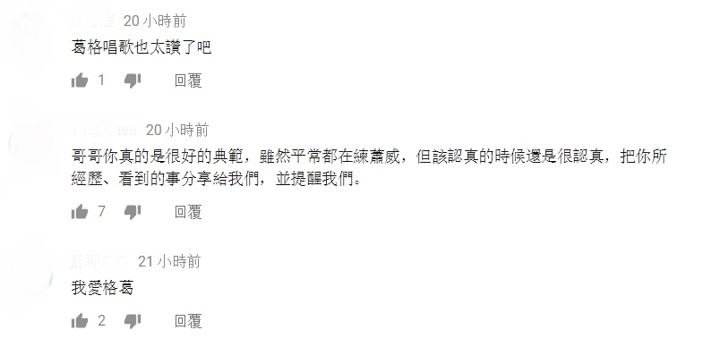 影片一PO出便大受好評,網友們紛紛留言回應「最喜歡葛格說道理」、「葛格唱歌也太讚了吧」、「我愛格葛」