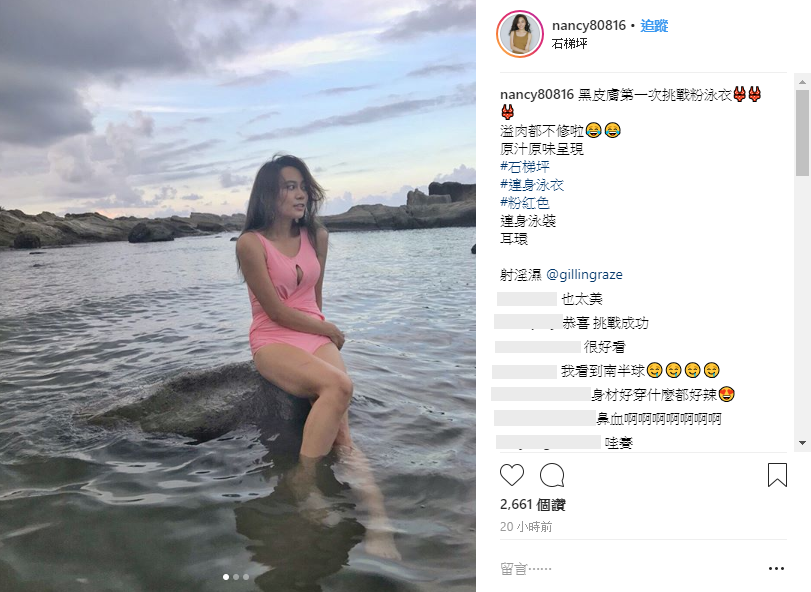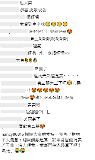 而平時鮮少展現身材的她這次難得發放福利,也讓網友看見之後興奮留言:「恭喜 挑戰成功」、「我看到南半球」、「身材好穿什麼都好辣」、「鼻血啊啊啊啊啊啊啊」、「好美~水一定很好玩」、「膚色跟泳裝顏色好搭」、「美美的」、「哇賽」。黑鬼兒之後自己也在留言提到本來拍得沒有很滿意,結果讚數超高,讓她哭笑不得表示:「我專門拍泳裝算了啊!」