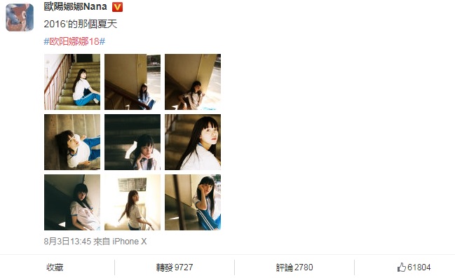 最新釋出的照片,是歐陽娜娜身穿學校運動服,以校園樓梯為背景拍攝。照片中,歐陽娜娜披著烏黑長髮,時而坐在階梯放空,時而回眸一笑,看來真的仙氣十足,另有一些扮鬼臉的俏皮畫面,模樣青澀可愛,令網友直呼「好漂亮好可愛」、「每一天都被美顏圈死」。