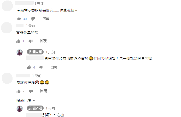 因為他們拍片的背景是書櫃,讓網友驚訝留言:「竟然在圖書館試保險套......你真棒棒」、「背景是真的嗎?」對此巴巴烙和亞亞也親回:「圖書館也沒有那麼多漫畫啦,你回去仔細看!每一個都是限量的喔」,表示背景並不是圖書館,並且書櫃的漫畫書都是限量的!此外由於他們這次的18禁開箱,網友也擔心留言:「應該會被鎖」,他們則回應:「別阿~心血」。