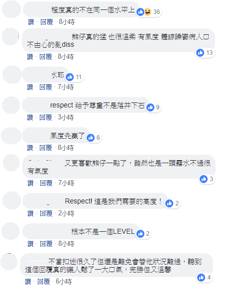 歌曲發布之後,許多網友也紛紛打上:「根本不是一個LEVEL」、「Respect! 這是我們需要的高度!」、「又更喜歡熊仔一點了,雖然也是一頭霧水不過很有氣度」、「完勝但又溫馨」、「體諒躁鬱病人口不由心的亂diss」,大讚熊仔的風度就已經先贏了。