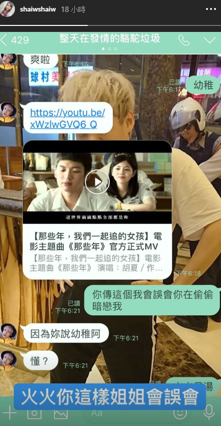 笑笑昨透過IG限時動態發文,只見她貼上自己和放火的對話截圖,表示「火火你這樣姐姐會誤會」。原來昨日笑笑在通訊軟體LINE說放火幼稚,放火則回傳《那些年》的歌曲MV,而此舉也讓笑笑回覆:「你傳這個我會誤會你在偷偷暗戀我」,放火也回傳:「因為你說幼稚啊,懂?」。特別的是從圖中還可以發現笑笑把放火的名稱改為:「整天在發情的駱駝垃圾」。