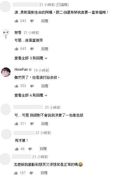 影片發布之後,網友也紛紛感動留言:「淚…勇敢面對生命的阿嘎,跟二伯還有蔡桃貴要一直幸福哦!」、「可....可惡 我絕對不會說我浪費了一包衛生紙」、「怎麼辦我感動到想哭又很想笑是正常的嗎」、「有洋蔥」,HowHow和蔡哥也留言:「雖然哭了,但是請打給叔叔」、「可惡 ...後面直接哭」。