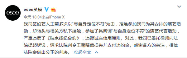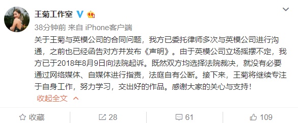 對此王菊工作室回應「對此王菊工作室回應「關於王菊與英模公司的合同問題,我方已委託律師多次與英模公司進行溝通,之前也已經函告對方並發布“聲明”。由於英模公司立場搖擺不定,我方已於2018年8月9日向法院起訴。既然雙方均選擇法院裁決,就沒有必要通過網絡媒體,自媒體進行指責,法庭自有公斷。接下來,王菊將繼續專注於自身工作,努力學習,交出好的作品。感謝大家的關心與支持!」希望無論如何,事情都能圓滿落幕,讓王菊能夠發光發熱阿!